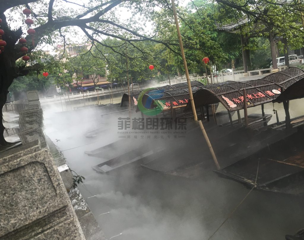 东涌水乡风情街位于广州市南沙区东涌镇启新路与官涌二街交会处,始建于珠江入海口西岸的濠涌两岸,全长约1千米,沿河涌布局青砖仿古建筑群,形成以小桥流水、乌篷船和镬耳屋为特色的岭南水乡景观。采用了菲格朗高科技微米级景观雾化雾森系统,科技高集成度高,可实现远程手机AAP物联网控制设备的运行日常工作。