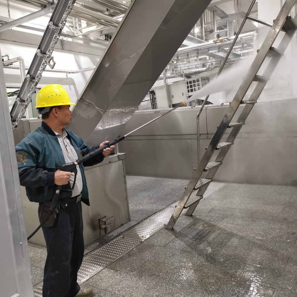 粤海食品(佛山)有限公司是一家大型现代化屠宰及肉品加工企业,日屠宰生猪超2000头、牛羊数百头,车间清洗任务繁重,卫生标准严苛。传统人工清洗耗水、耗时,且高压水枪用电安全隐患大,难以同时满足效率与洁净度要求。