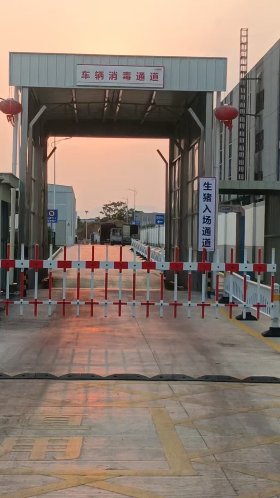 在生猪运输车辆进入厂区的大门口,部署了菲格朗全自动车辆消毒通道。该设备采用高压喷雾与喷淋组合技术,可对车底、车身、轮胎进行360度无死角喷淋消毒。配置智能感应启动系统,车辆通过时自动触发,消毒液配比精准,既保证消杀效果又节省药剂,有效阻止外来病原体进入生产区。